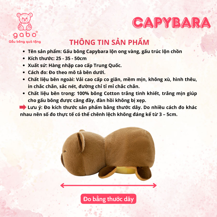 CHẤT LIỆU BÊN NGOÀI : Gấu bông capybara lộn ong vàng làm từ vải cao cấp co giãn, mềm mịn, không xù , hình thêu, in chắc chắn, sắc nét , Đường chỉ tỉ mỉ chắc chắn, thẩm mĩ cao bởi thợ có tay nghề lâu năm tại Gấu Bông Vân Anh
