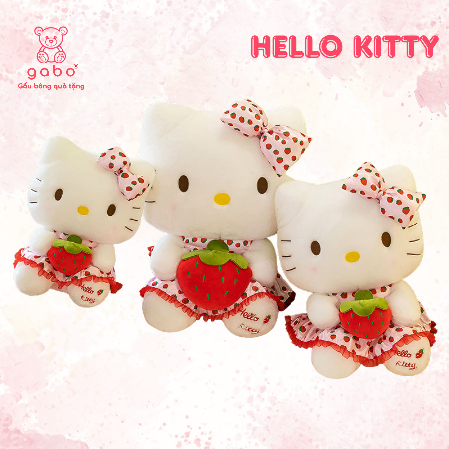 – TÊN SẢN PHẨM: Gấu Bông Hello Kitty Ôm Dâu, Mèo Kitty Váy chấm Bi Ôm Dâu, Quà Tặng Cho Bé Gái GABO TEDDY BEAR