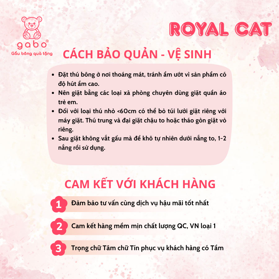 – Không nên giặt bằng máy với các loại Gấu bông Mèo Hoàng Thượng. Đối với loại thú bông chất liệu lông nhung có thể giặt bằng máy nhưng nên hạn chế