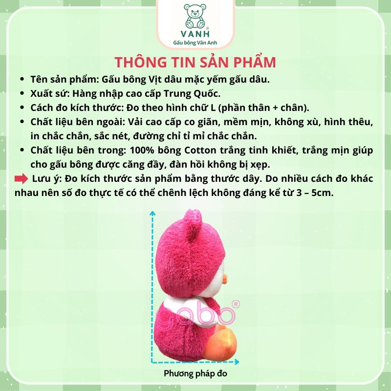 – TÊN SẢN PHẨM: Gấu Bông Vịt Dâu Mặc Yếm Gấu Dâu, Vịt Cosplay Lotso Hàng Quảng châu mới về